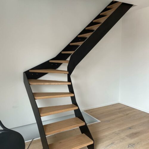 Escalier en acier avec des marches en bois, les limons ont été découpé par un laser pour un maximum de précision.