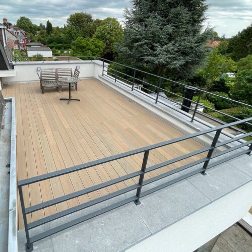 Ces deux terrasses superposées ont été placées à l’arrière d’une maison en rénovation. Le bois que nous avons posé est du bois exotique de type ipé. Un pare voisin avec des verres opalin a été intégré au garde-corps pour préserver l’intimité des clients lorsqu’ils profiteront de leurs terrasses.