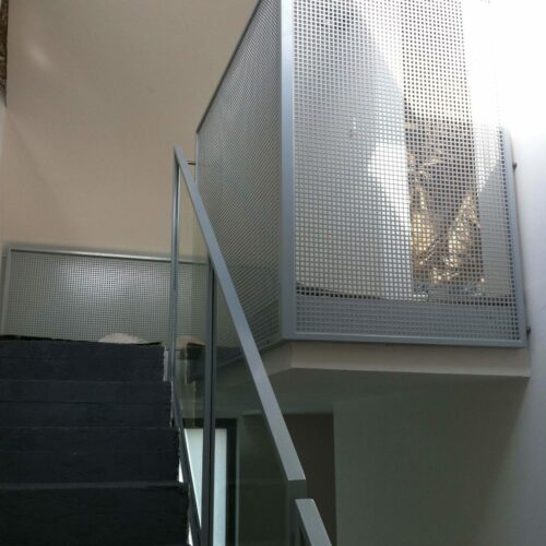 Escalier en acier avec garde-corps en acier deployé. Design LRArchitectes.