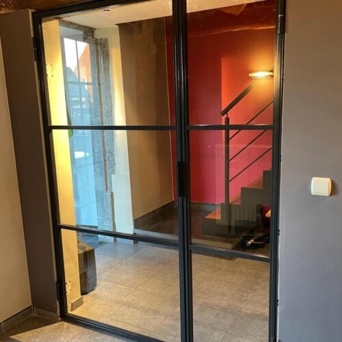 Porte en acier et verre transparent remplaçant porte d’origine en bois massif.
